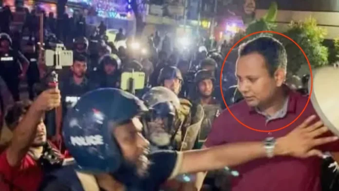 কাকরাইলে জাতীয় পার্টির কেন্দ্রীয় কার্যালয়ের সামনে গণঅধিকার পরিষদের নেতাকর্মীদের ওপর হামলাকারী লাল রঙের টি-শার্ট পরিহিত যুবক পুলিশের একজন কনস্টেবল। এমন দাবি করেছেন গণঅধিকার পরিষদের সাধারণ সম্পাদক রাশেদ খান।