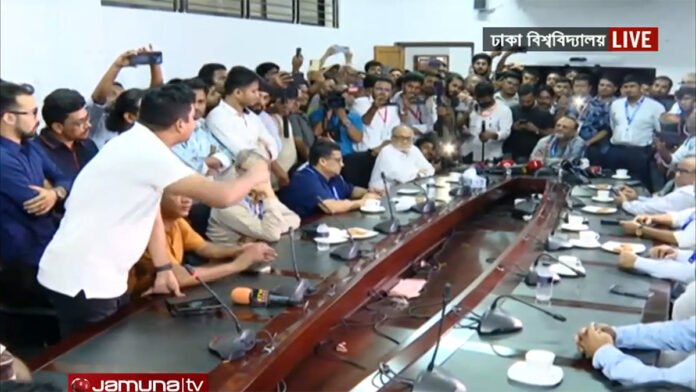 আজ মঙ্গলবার (৯ সেপ্টেম্বর) বিকেলে ঢাবির সিনেট ভবনে তাদের অভিযোগ ভিসির কাছে তুলে ধরেন ছাত্রদলের কেন্দ্রীয় নেতারা। এ সময় ছাত্রদল নেতাকর্মীদের ভিসির সঙ্গে উচ্চবাক্য ও টেবিল চাপড়ে কথা বলতে দেখা যায়।