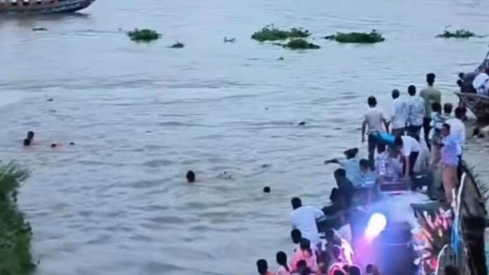 জানা যায়, গত বৃহস্পতিবার বিকেলে বিজয় দশমীতে প্রতিমা বিসর্জন দিতে পরিবারসহ একটি ইঞ্জিনচালিত নৌকায় আসেন তারা। এসময় অন্য একটি নৌকার সঙ্গে ধাক্কা লেগে নৌকাটি উল্টে ডুবে যায়। নৌকায় শিশুসহ ১৮ জন লোক ছিল। অন্যরা সবাই সাঁতরে তীরে উঠতে পারলেও অঙ্কিত ও তন্ময় নামে দুই শিশু নিখোঁজ হন। রাতভর নিখোঁজ দুই শিশুর স্বজনদের আহাজারি দেখা যায় সেখানে।