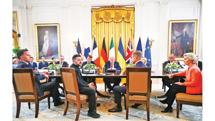 এদিন ইউক্রেনের প্রতি সমর্থন জানাতে হোয়াইট হাউসে হাজির ছিলেন যুক্তরাজ্যের প্রধানমন্ত্রী কিয়ার স্টারমার, জার্মানির চ্যান্সেলর ফ্রিডরিশ মের্ৎস, ফ্রান্সের প্রেসিডেন্ট ইমানুয়েল মাখোঁ, ইউরোপীয় কমিশনের প্রেসিডেন্ট উরসুলা ফন ডের লায়েন ও ন্যাটো মহাসচিব মার্ক রুটে।